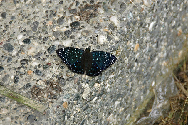 流星蛺蝶(Dichorragia nesimachus formosanus),展翅寬45~50mm,翅膀為藍黑色,翅緣有一排開口朝外的V字型白色斑紋,翅膀上的散生白斑,宛如夜空中劃過天際的流星。雌雄的差異不明顯