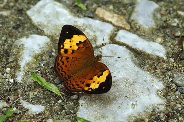 黃斑蝶【Cupha erymanthis】,展翅寬55~60mm,翅膀上翅表面端部黑色,中央有一大塊黃色斜斑,下翅外緣為波浪狀黑斑。腹面為黃褐色,雌雄差異並不明顯。