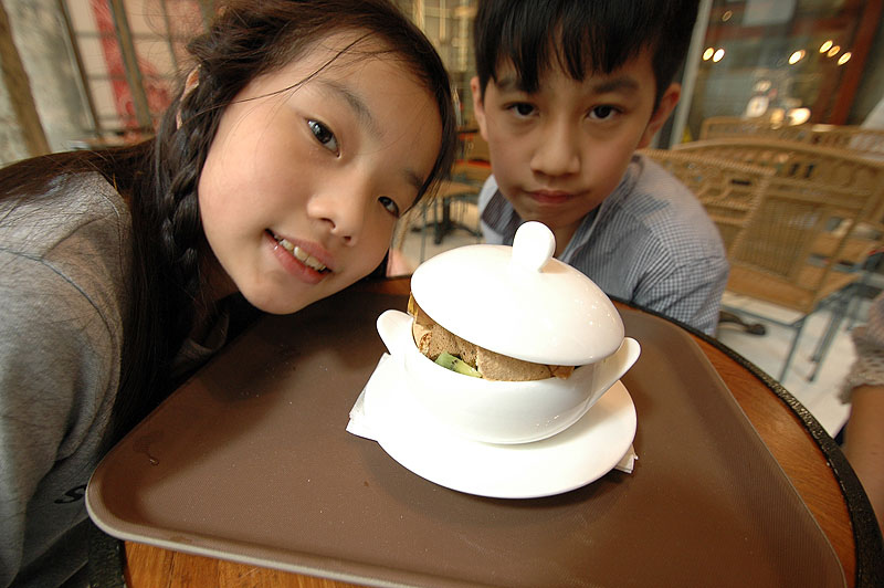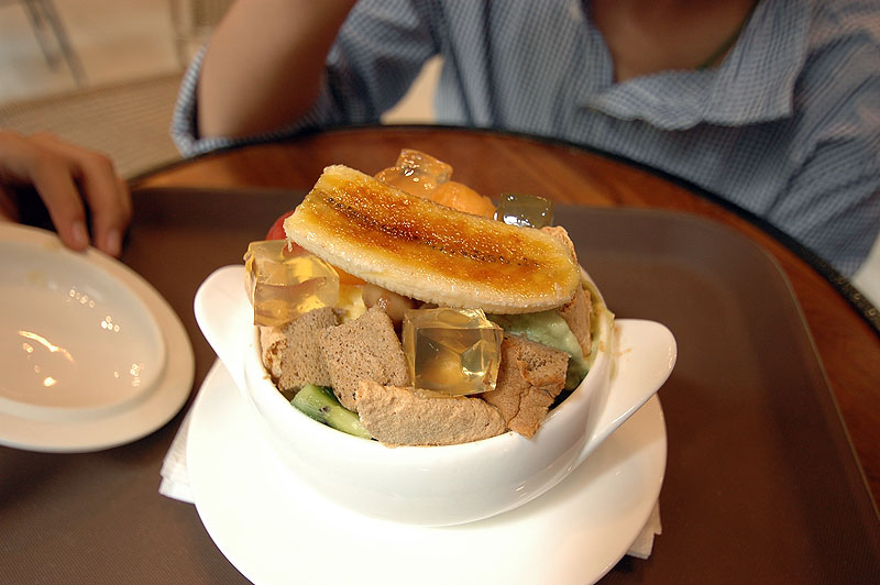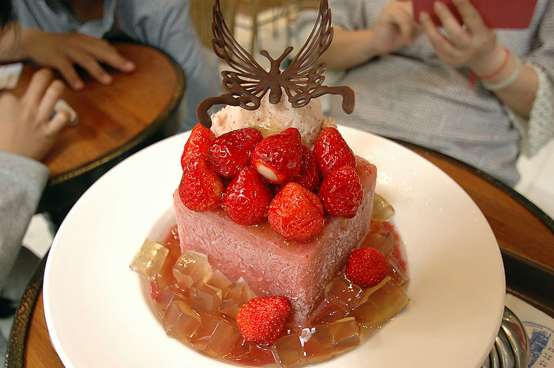 我們六人點了一份草莓冰磚,價位頗高,這樣一份要價450元,不過既然大老遠跑來這裡,再不嘗點東西,好像也說不過去。雖說價格偏高,不過這個冰磚份量還真不少,讓我們家六人吃綽綽有餘,新鮮草莓香甜可口,冰磚也是草莓口味的,一旁還有許多茶凍,老實說,還滿好吃的